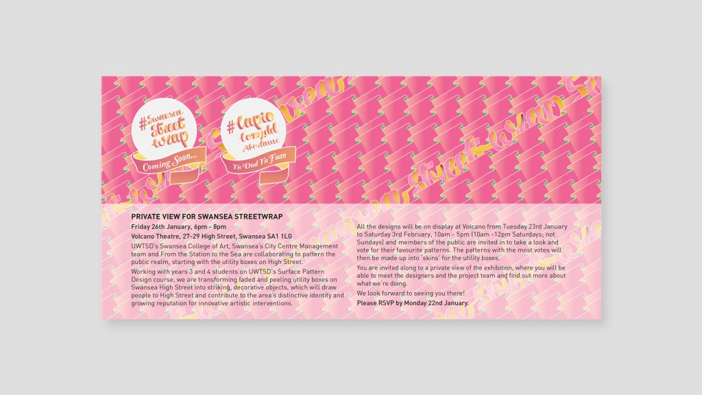 In my third-year university project, I had the opportunity to collaborate with colleagues Isaac and the Surface Pattern course to develop the exhibition branding for Swansea Street Wrap. The project involved creating a logo and pattern that was applied consistently across the brand, including posters, banners, stickers, and invitation cards. Also, patterns were used to wrap street junction boxes around the city. This experience strengthened my skills in collaborative design, branding, and applying graphic concepts to a real-world public.